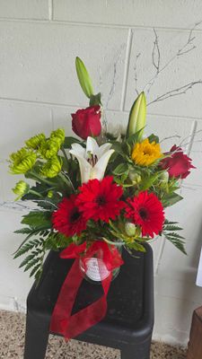 A gorgeous arrangement of flowers in xmas colors with traditional